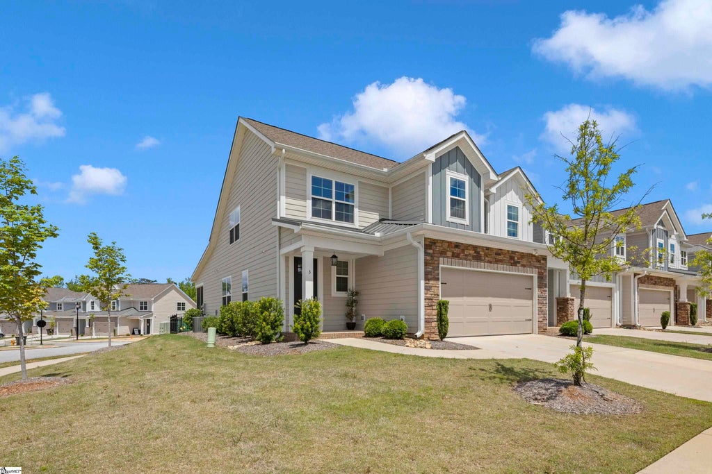 This luxury end unit at Hamilton Townes features an open-concept layout that's perfect for everyday living and effortless entertaining. The popular Halton plan has a beautiful upgraded kitchen with granite countertops, 42'' painted cabinetry with soft-close doors and drawers, stainless steel appliances including a gas range, and an oversized island with additional storage. The kitchen flows seamlessly into the dining area and living room and sliding doors lead to a screened-in covered porch for year-round enjoyment. The main-level owner's suite is a private retreat featuring a spacious walk-in closet and a spa-like bathroom with dual vanities. Wide plank 5'' hand scraped hardwood flooring runs throughout the main level and stairs. Upstairs, you'll find two generously sized bedrooms that share a well-appointed bathroom with double vanities. A flexible loft space provides endless possibilities. Electric car level 2 charger outlet. Located in the thriving Verdae area, this townhome provides exceptional convenience with easy access to I-85, I-385, and Woodruff Road. Just 10 minutes from downtown Greenville, it also connects directly to the newest Swamp Rabbit Trail extension. Highlights include a two-car attached garage, main-level owner's suite, expansive covered porch, a private fenced backyard with HOA-maintained landscaping and exterior services. Discover this beautifully upgraded corner-site townhome at Hamilton Townes at Verdae.